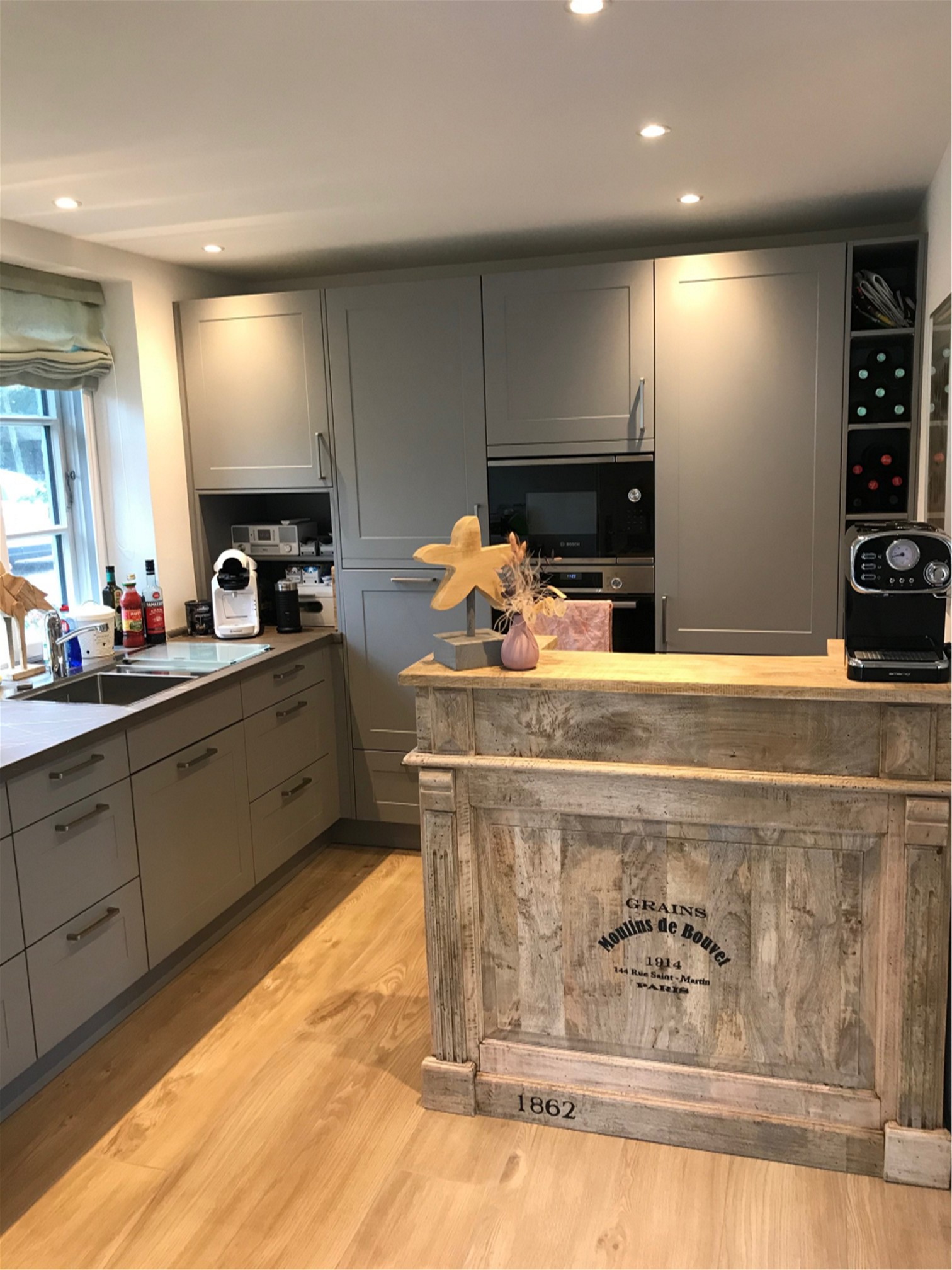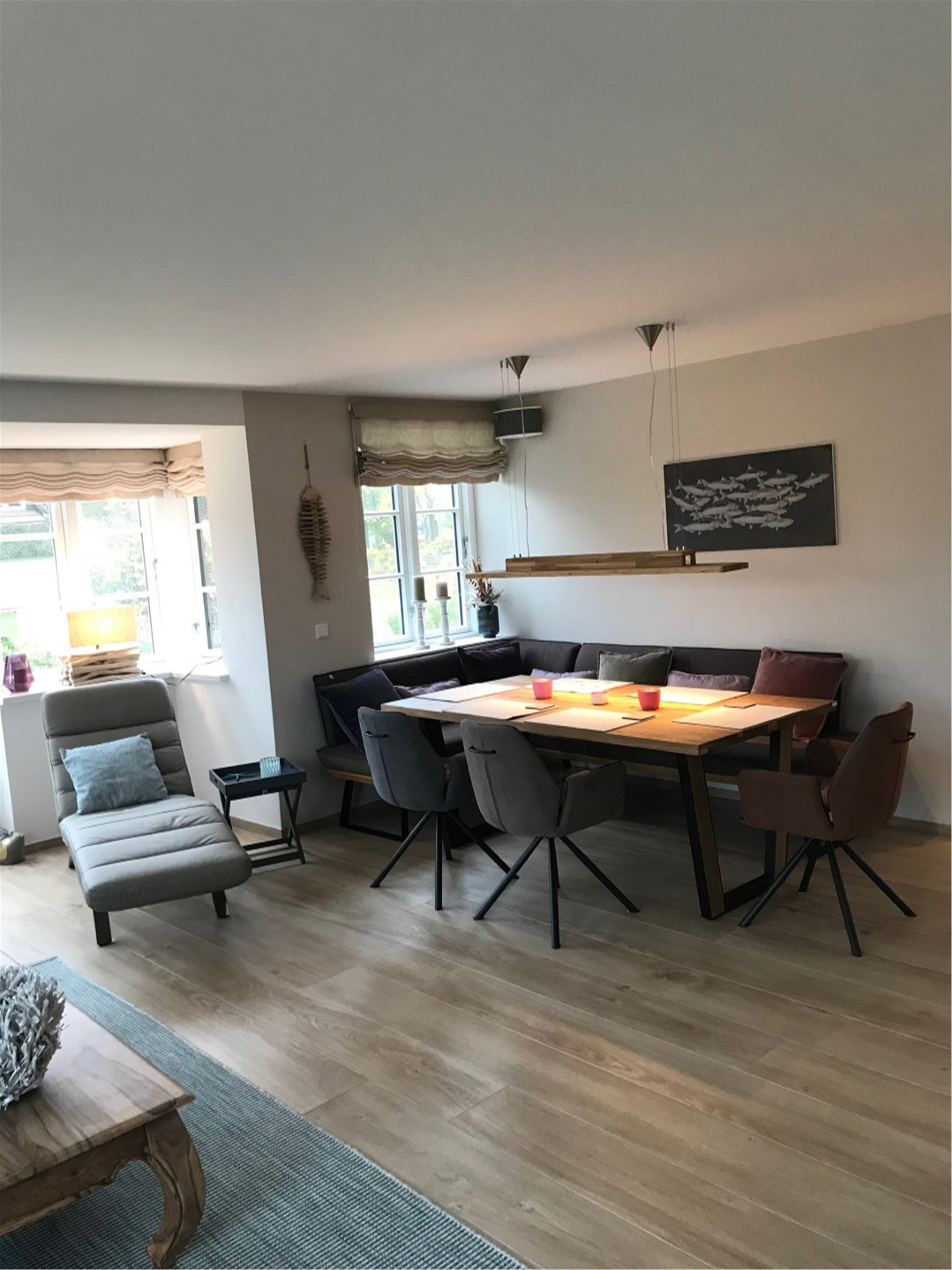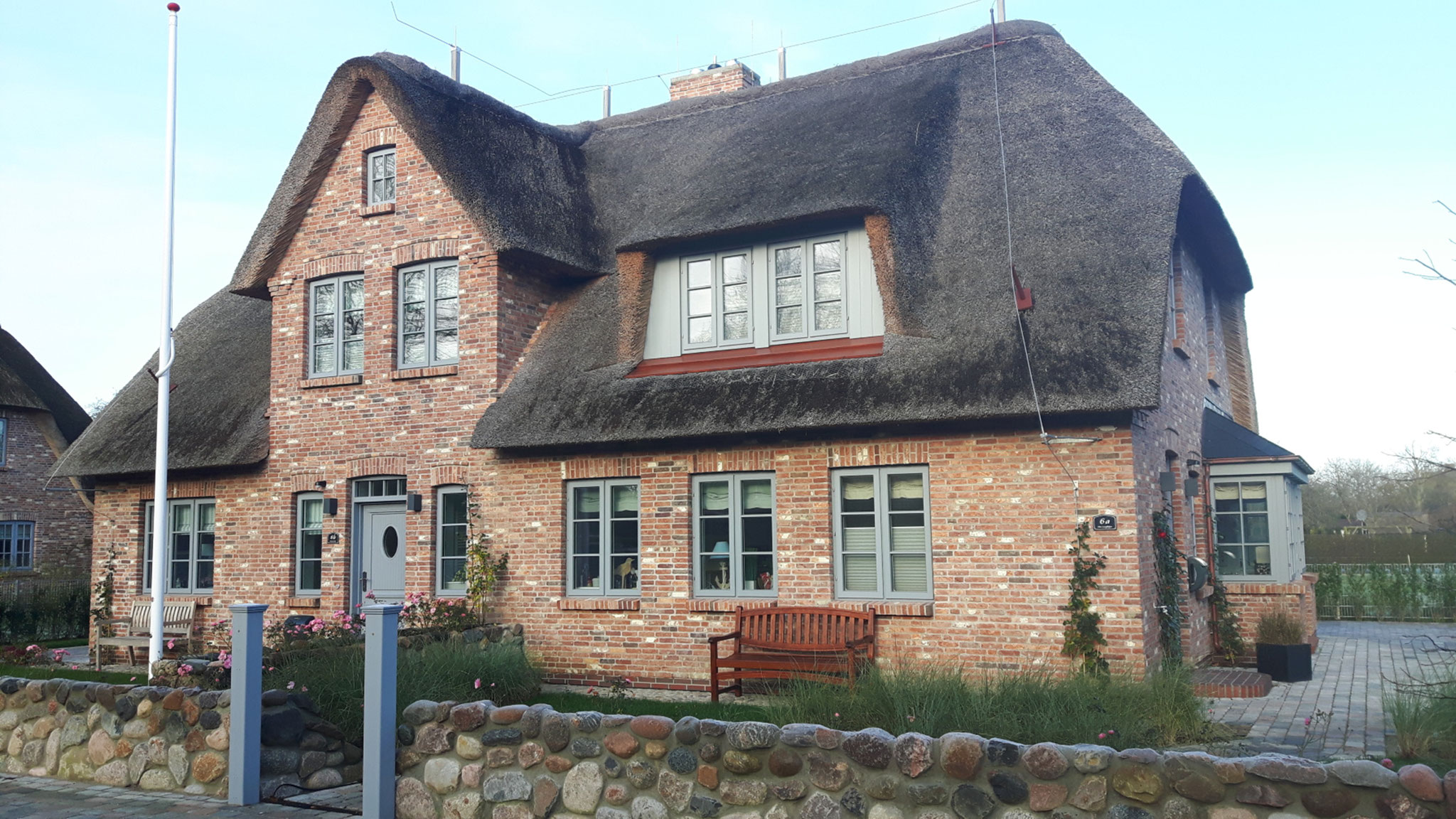 Holzsprossenfenster, Reeteindeckung, zweischaliges Verblendmauerwerk, liebevolle Details mit schönen Fliesen und Holzarbeiten.