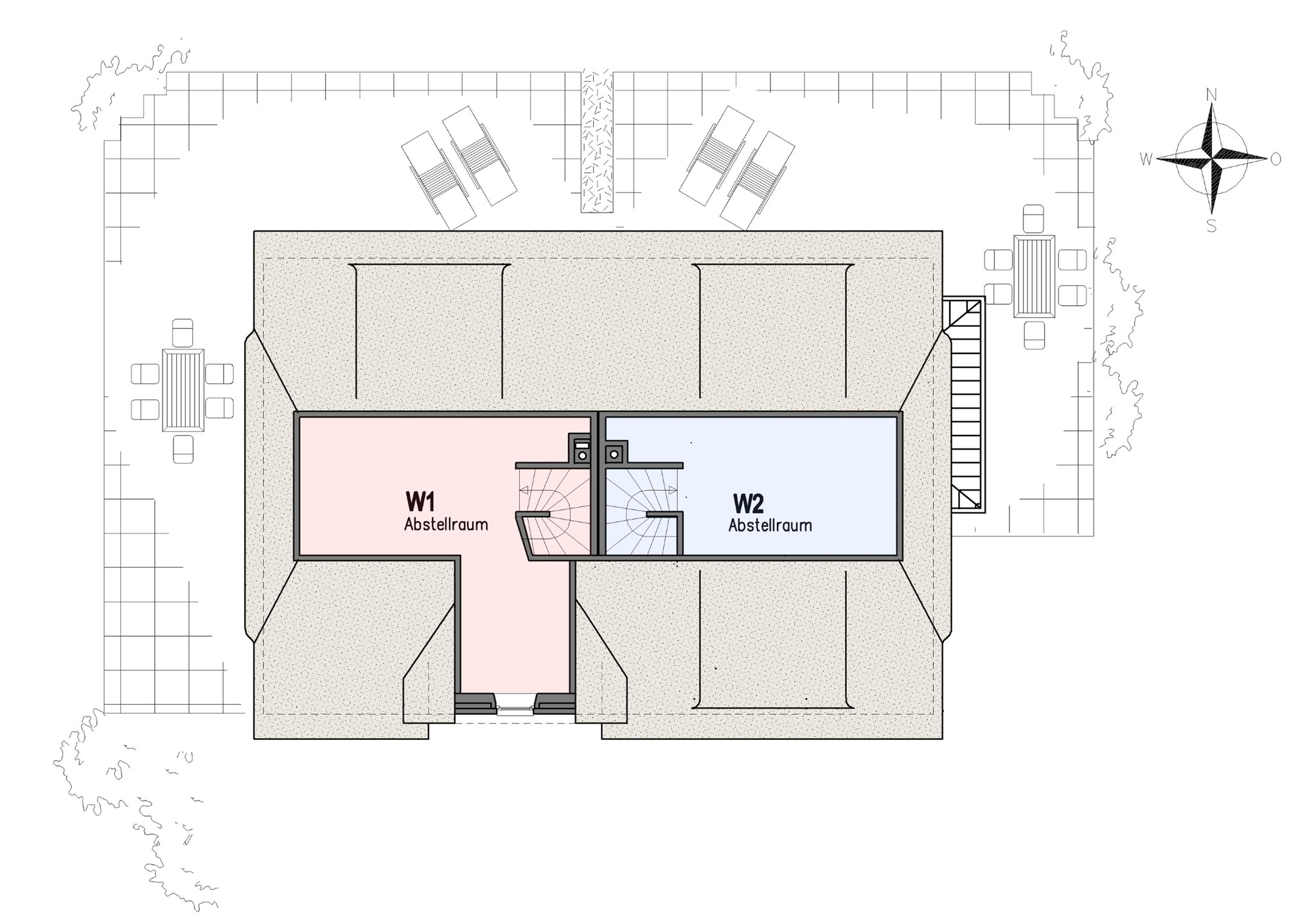 Hinter dem Haus befindet sich ein Abstellschuppen für die Haushälfte.