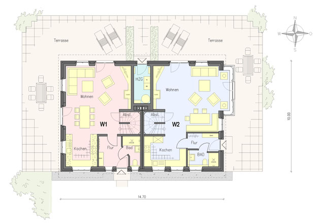 118,40 m² bietet im Erdgeschoss ein großes Wohnzimmer mit Essplatz und integrierter Küche, Bad, Diele und ein Abstellraum. Ein gemeinsamer Haustechnikraum mit Zugang von der Nordseite befindet sich ebenfalls im Erdgeschoss.
