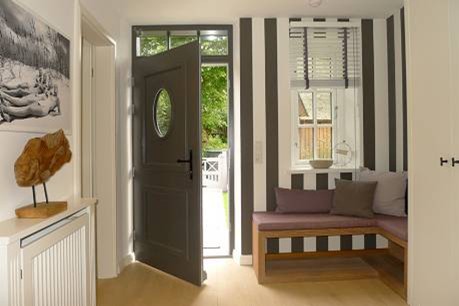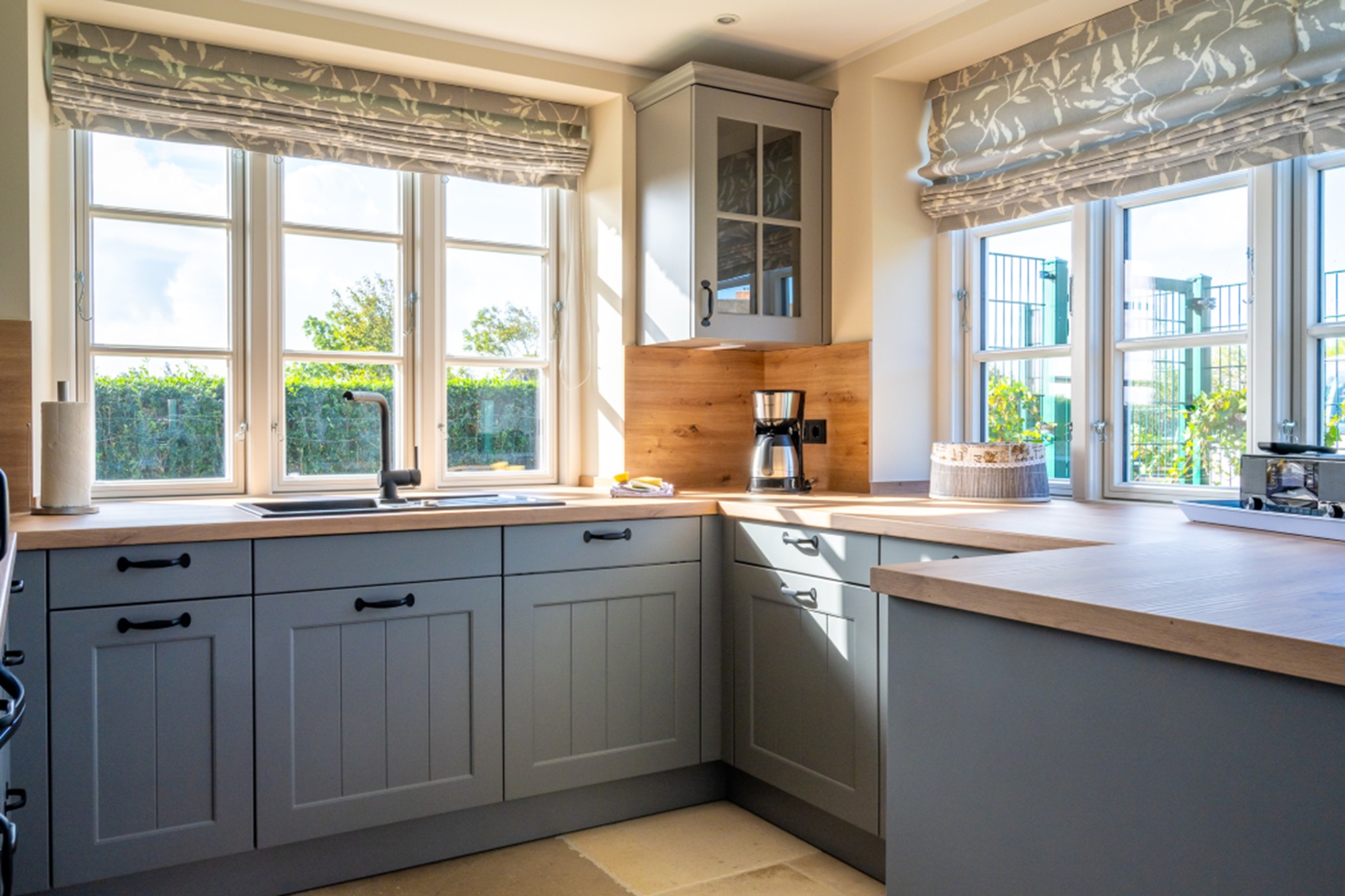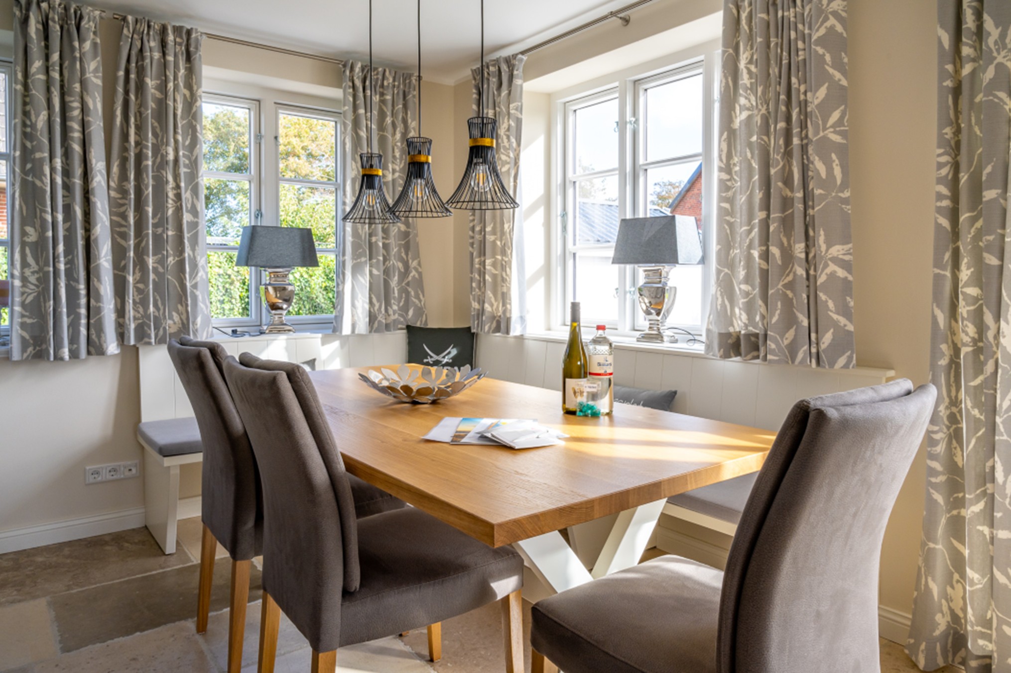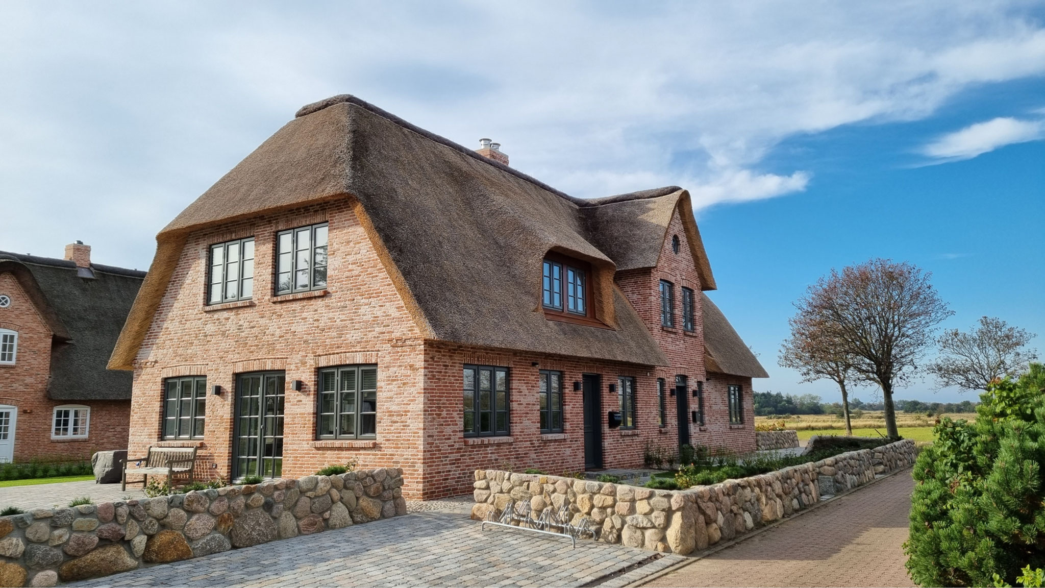 Holzsprossenfenster, Reeteindeckung, zweischaliges Verblendmauerwerk, liebevolle Details mit schönen Fliesen und Holzarbeiten.