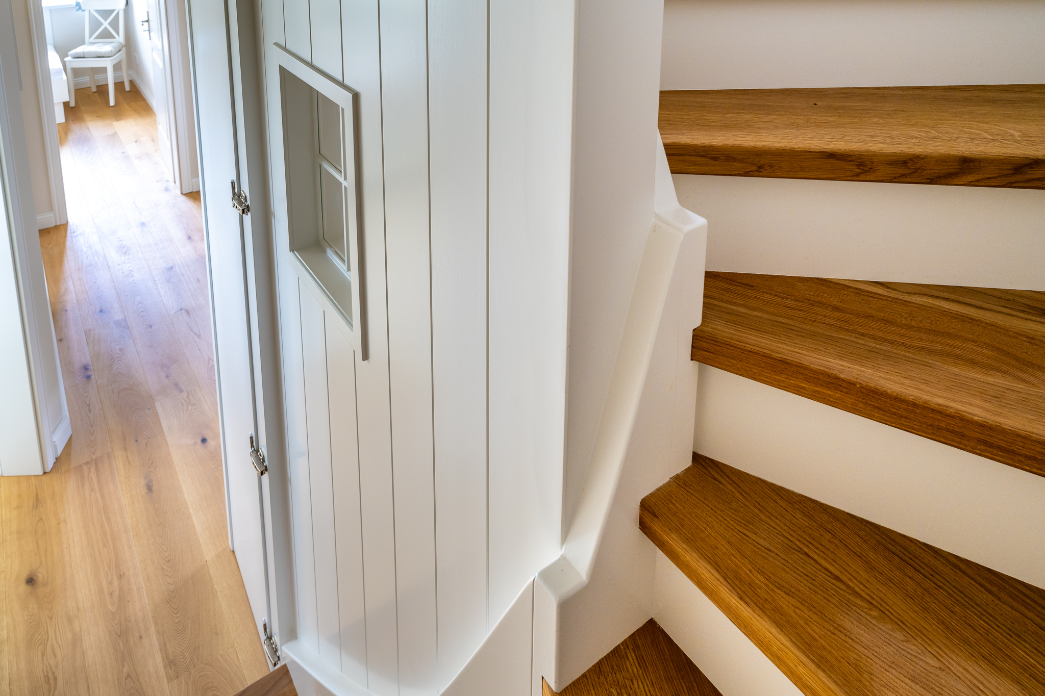 Das Dachgeschoss ist ausgestattet mit drei Schlafzimmer, Abstellraum, ein Bad und ein Flur.