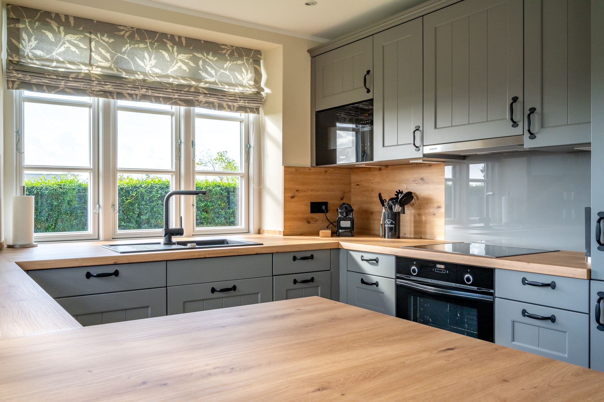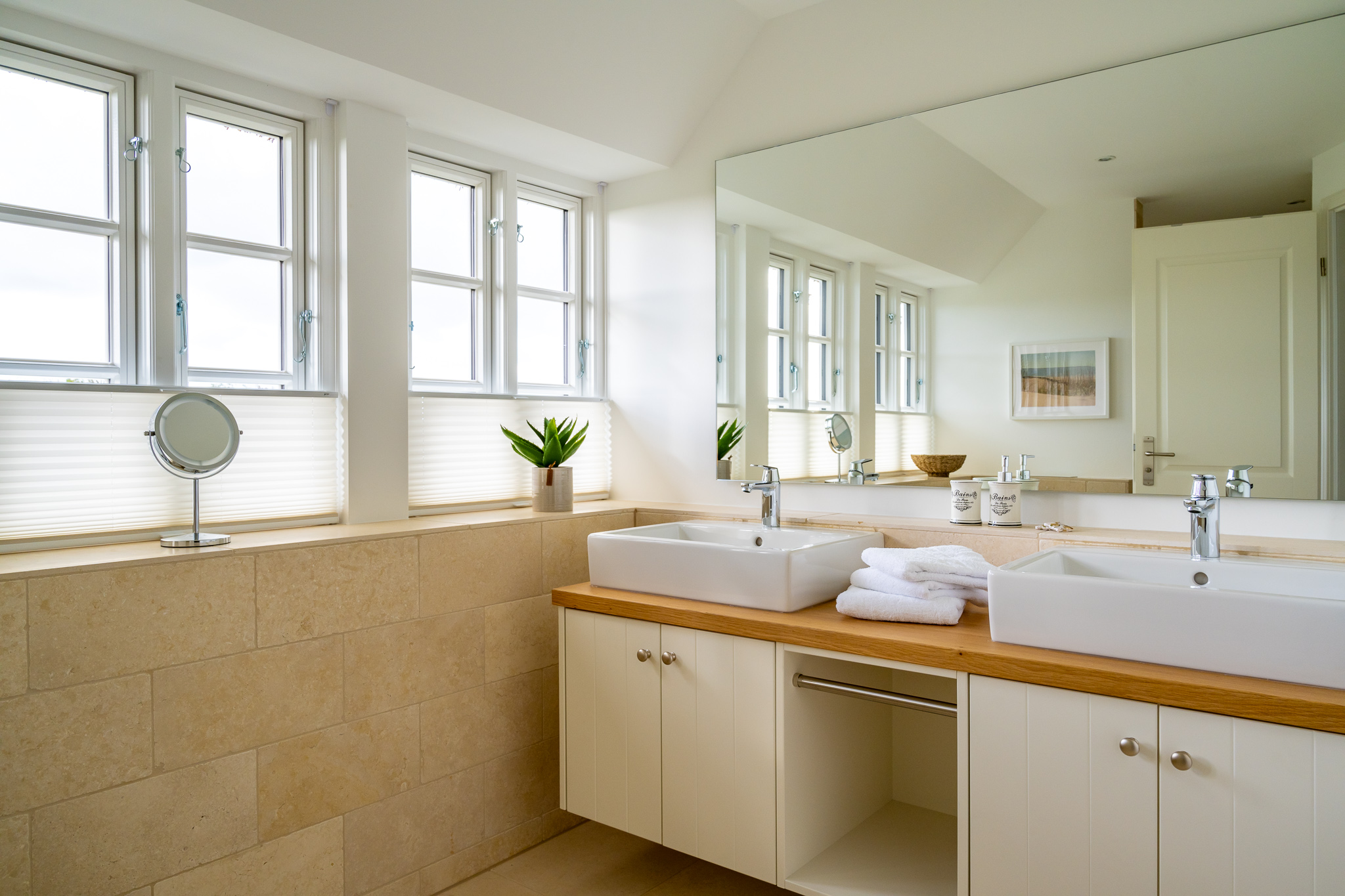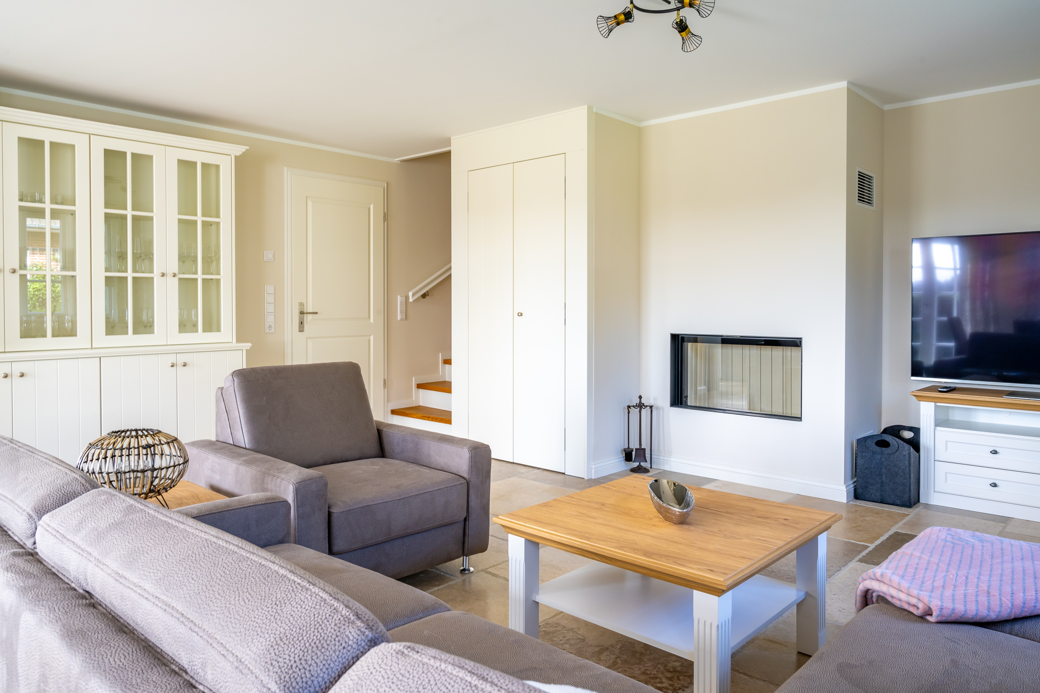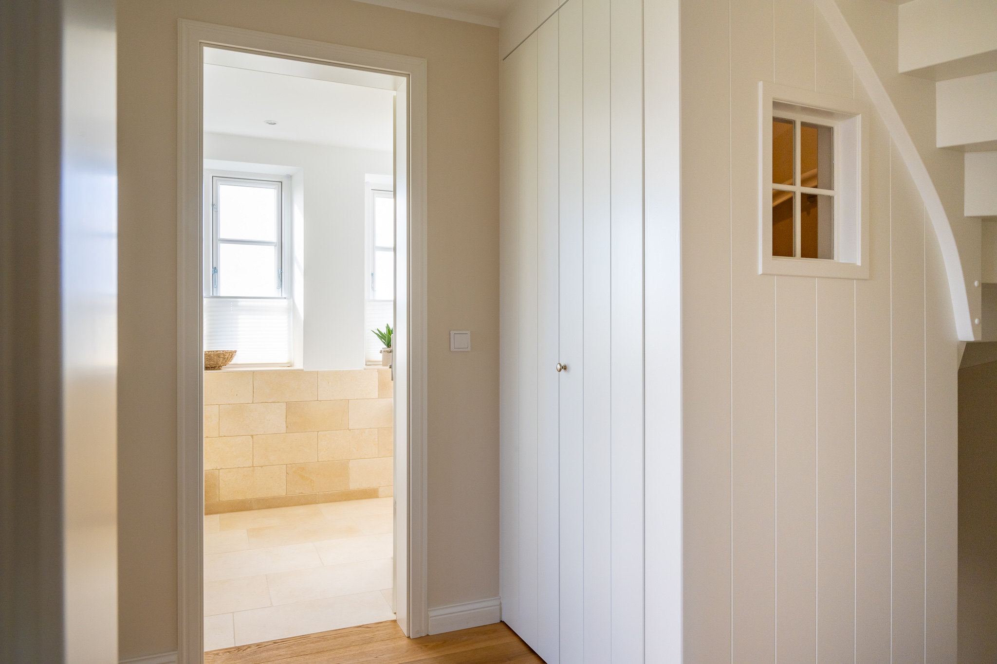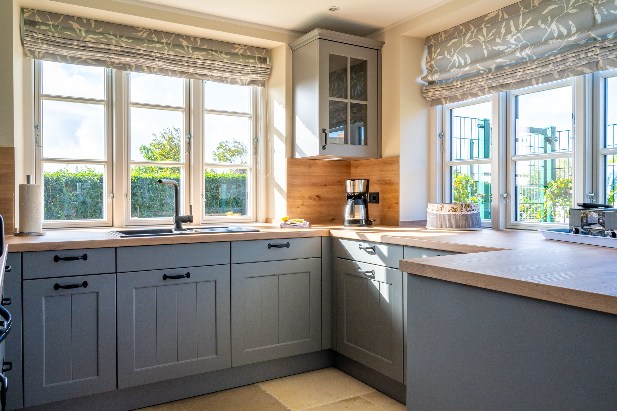 Holzsprossenfenster, Reetdacheindeckung, zweischaliges Verblendmauerwerk, liebevolle Details mit schönen Fliesen und Holzarbeiten.