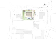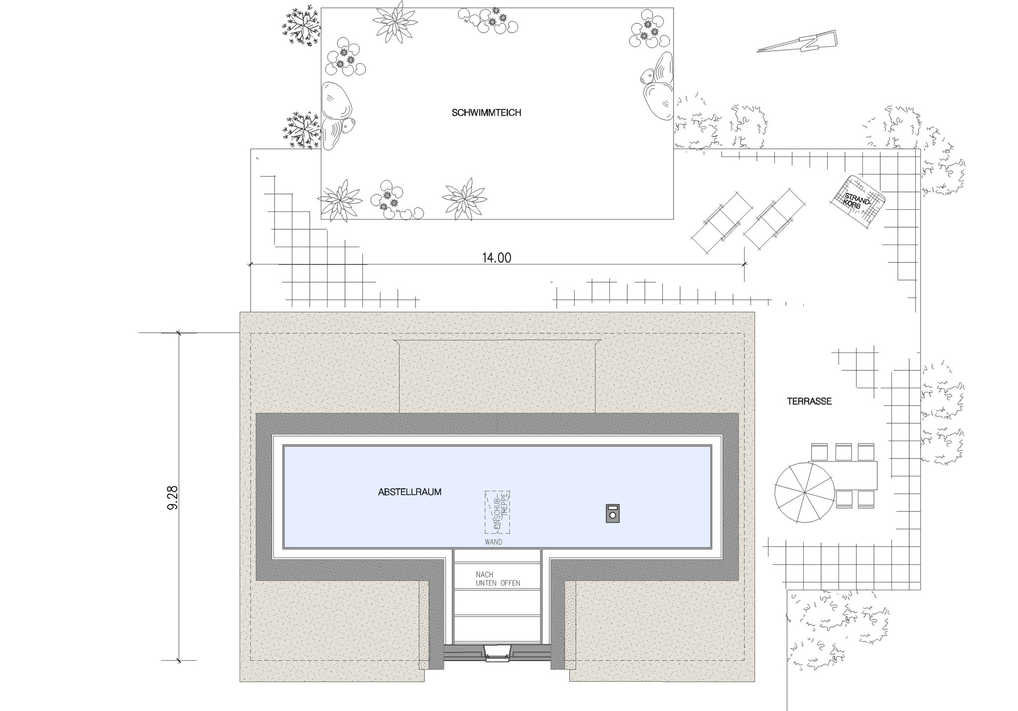 In der Gartenfläche ist eine befestigte Terrassenfläche von insgesamt