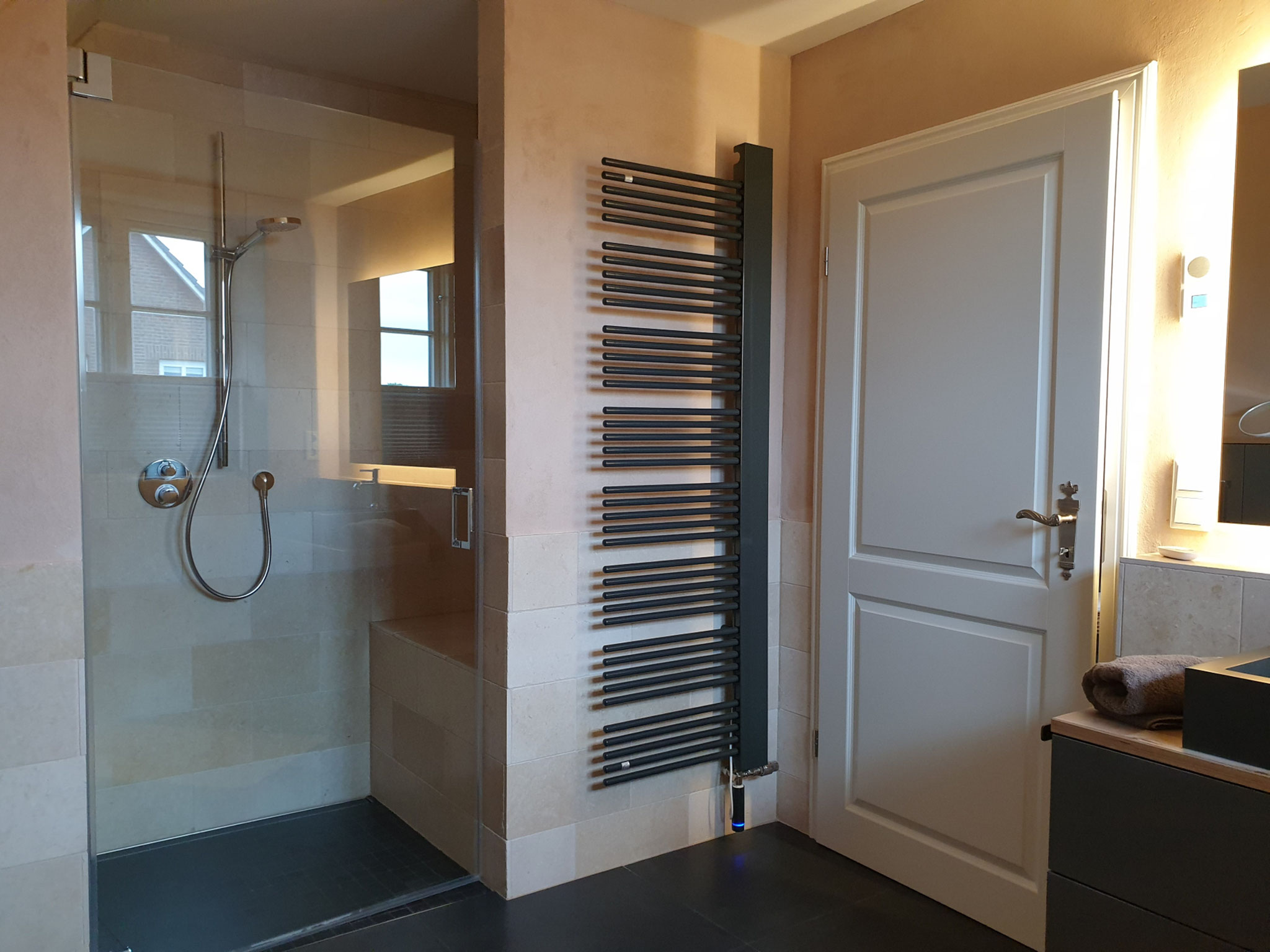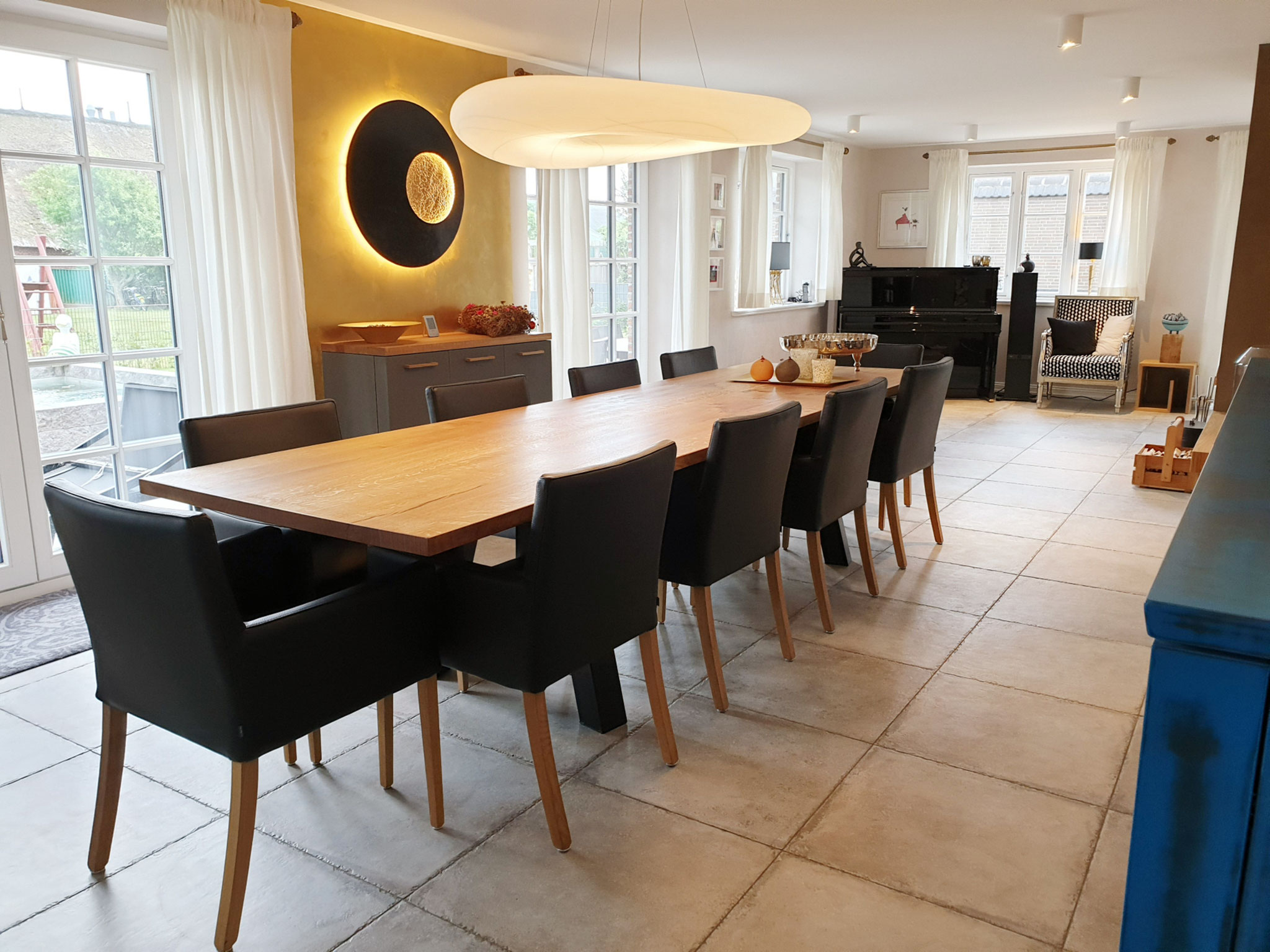 Das Erdgeschoss ist hochwertig gefliest, im Dachgeschoss liegen Dreischichtdielen in Eiche weiß geölt. Die Bäder sind mit Natursteinen gefliest.
