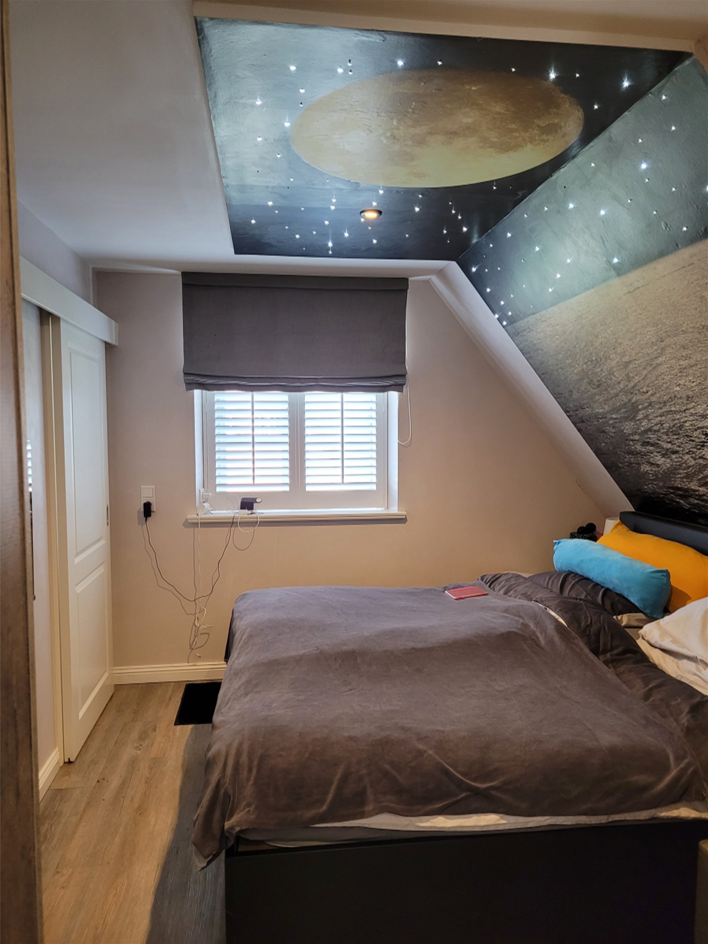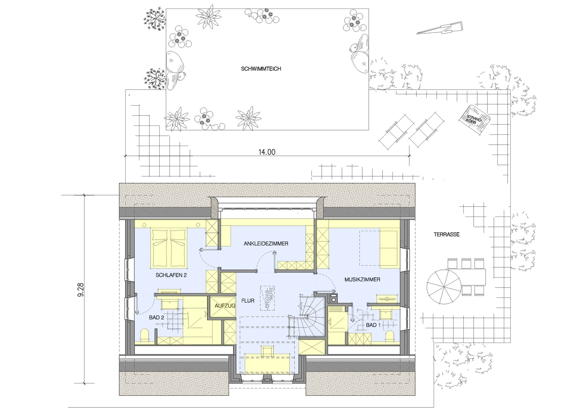 Das Dachgeschoss ist ausgestattet mit zwei Schlafzimmer, zwei Duschbäder, Ankleidezimmer und einem Flur.