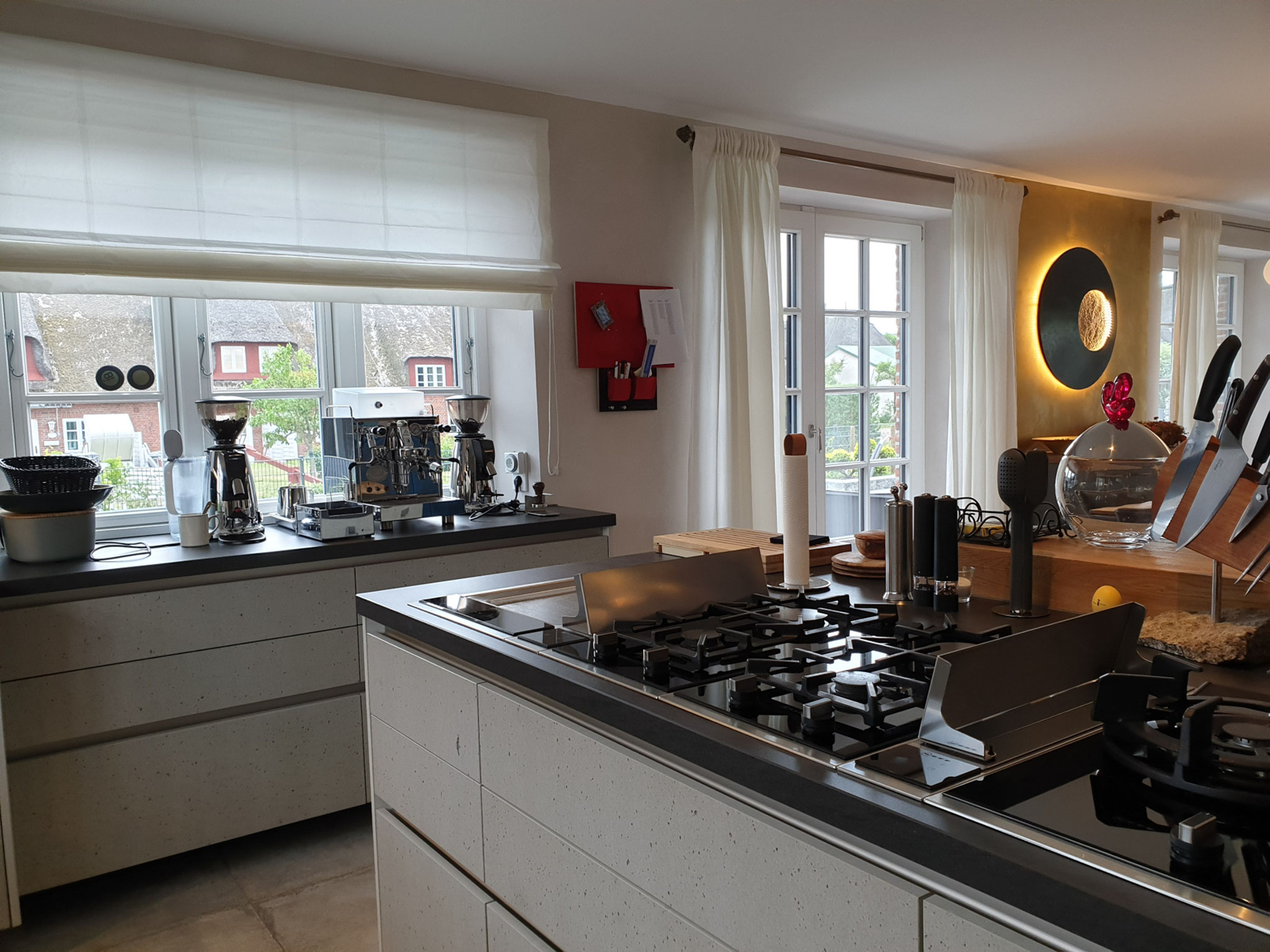Holzsprossenfenster, Reeteindeckung, zweischaliges Verblendmauerwerk, liebevolle Details mit schönen Fliesen und Holzarbeiten.
