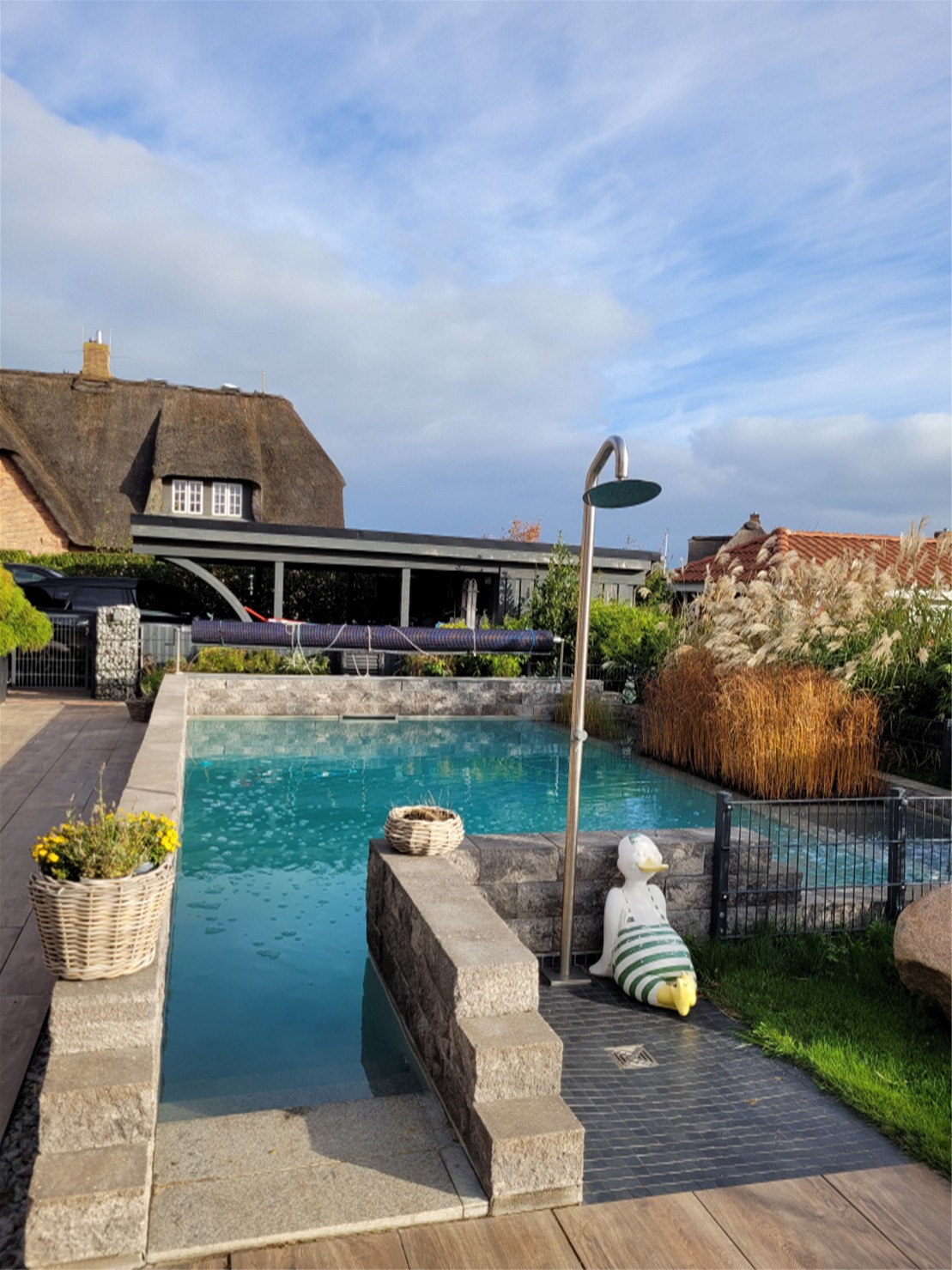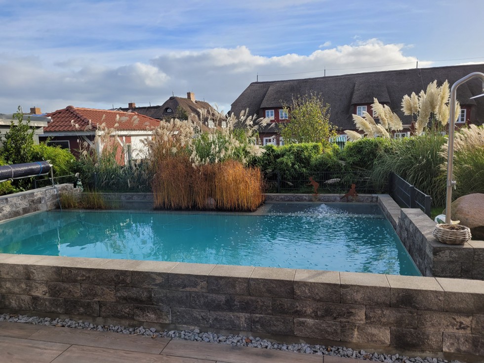 Im Garten befindet sich ein schön angelegter Schwimmteich im Anschluss an die Terrasse, der über eine Wärmepumpe betrieben wird.